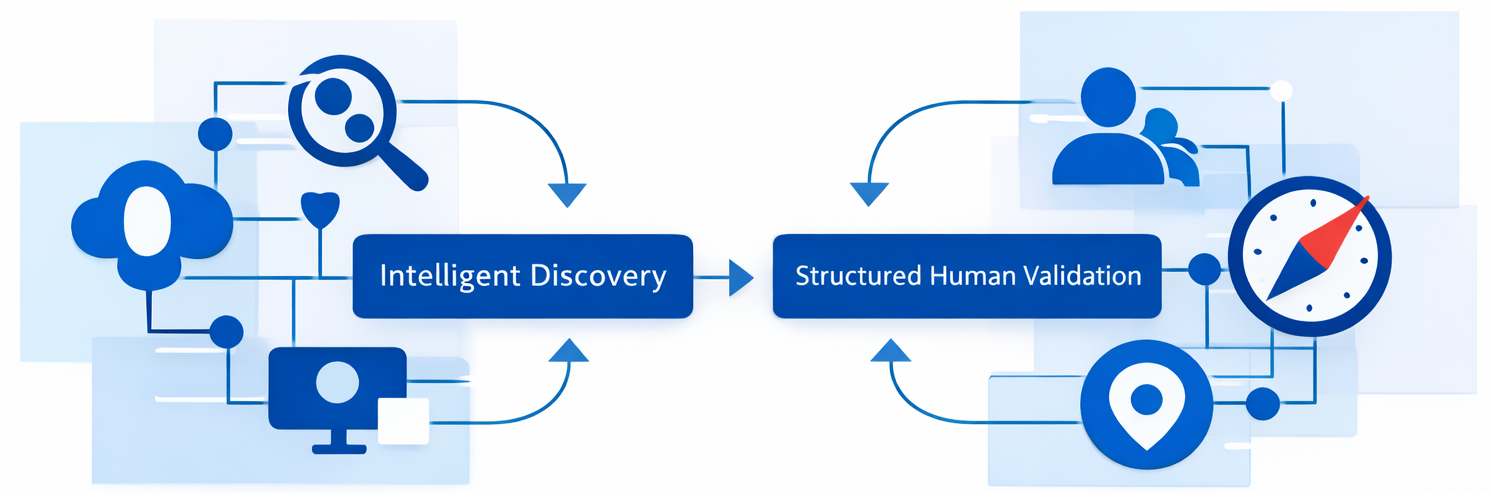 We combine intelligent discovery with structured human validation. Instead of replacing human expertise, we augment it, connecting automated signals with people who know the systems best.